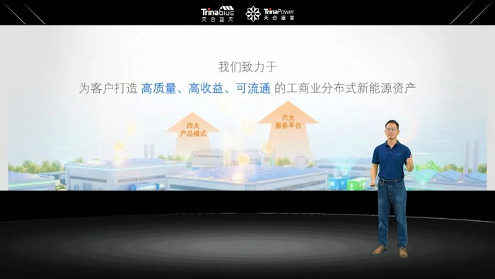 天合富家工商业产品规划部负责人易金鑫在发布会上深入解读了原装3.0的产品布局。他指出,原装3.0的核心在于构建一套“模式+平台”的双层赋能体系:四大产品模式提供灵活的合作方案,涵盖供应链模式、全周期服务模式、自投模式、资产销售模式;六大平台能力则作为底层支撑,贯穿工程质量、数字化、品牌营销、供应链、电力交易与金融服务六大关键领域。两者的协同,旨在帮助合作伙伴降低运营成本、提升收益水平、加快资产周转,实现从“合作做项目”到“长期能力共建”的转变。