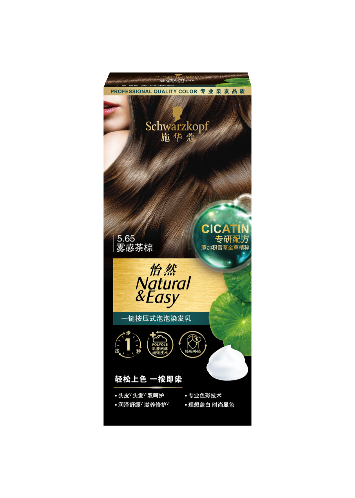 • 施华蔻怡然一键按压式泡泡染发乳(5.65雾感茶棕):施华蔻创新气雾染发科技,“会按就会染”,在高效上色、修护发丝与使用便携度间找到平衡点。特配热门舒缓成分积雪草精粹等9重植粹,在染发过程中予你更温和的头皮发丝双呵护。真空气雾剂设计无须混合,高能密闭仓设计,随时补染如初。1按即染,4倍显色,6倍呵护。5.65雾感茶棕色调低调雅致,呈现自然透亮的棕色质感,轻松打造新年新“型”。