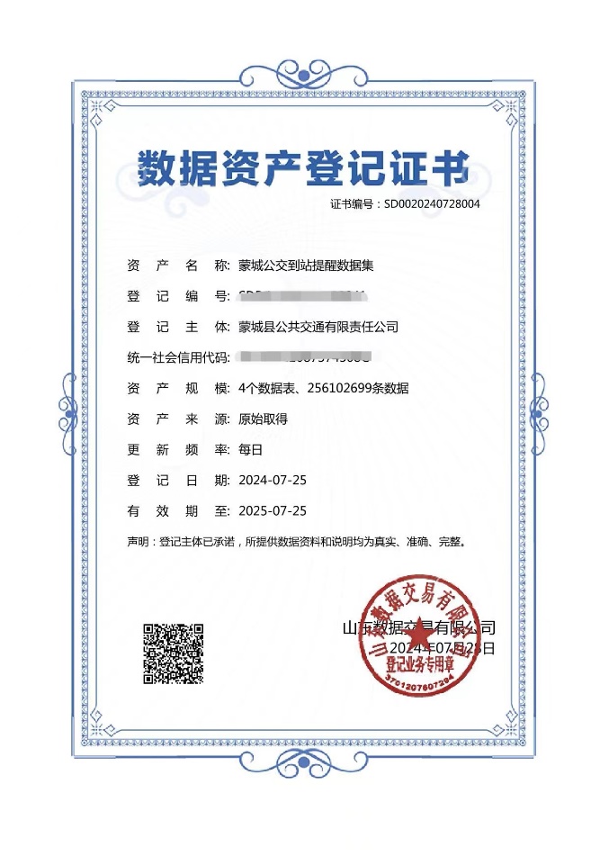 近日,在浪潮卓数大数据助力下,安徽省亳州市蒙城城建集团完成“城市公交数据”的数据治理、合规确权、资产登记、质量评估、资源入表等工作,标志着亳州市实现了数据资产入表“零的突破”。