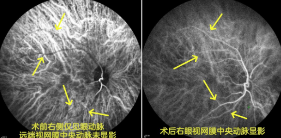 术后第一天检查显示,张老伯右眼视网膜阻塞的血管复通;术后一周复查右眼视力由术前“眼前指数”(仅能看清眼前晃动的手指)恢复至0.15。