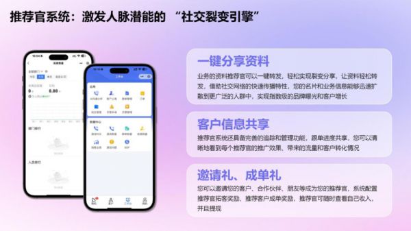 创新性地内置了激励相容的推荐官系统。通过透明的分层激励规则与可视化的效果看板,系统能够有效激活员工、客户及合作伙伴的社交网络资源,将零散的分享行为转化为可追踪、可量化、可优化的系统性增长渠道。结合一键生成营销素材的功能,它显著降低了品牌社交传播的门槛与成本。