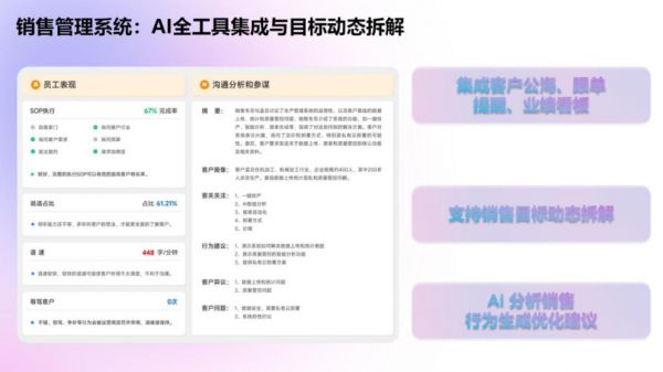 超越传统的客户关系管理(CRM),该系统深度融入销售实战流程。它提供从客户公海智能分配、销售流程可视化、到业绩目标动态拆解的全套工具。其核心优势在于AI复盘能力——系统能自动分析销售行为与成交结果的相关性,生成个性化的能力诊断报告与改进建议,成为销售团队可持续成长的“数字教练”。
