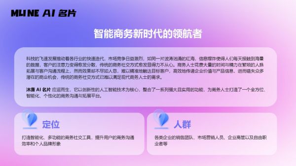 沐廉AI名片的问世,标志着商务工具正从“流程信息化”阶段迈向“决策智能化”的新时代。其背后的逻辑是以AI为核心,重新连接人、信息与商业机会。这不仅是沐廉控股技术实力的体现,更是其对未来工作方式与商业生态的前瞻性思考。